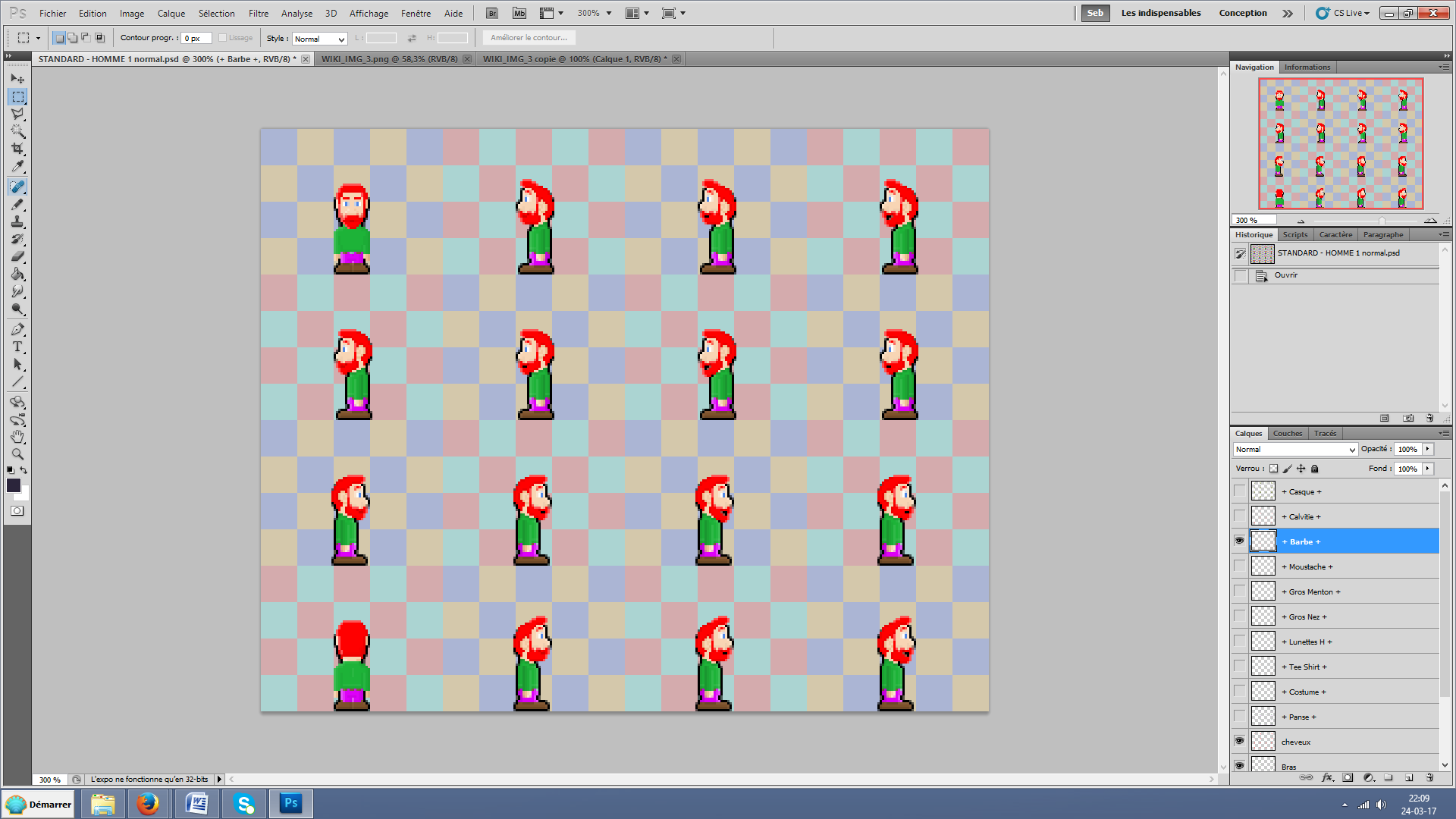 Tout au long de la trilogie, les graphismes autant que les musiques sont aussi des créations de l'auteur des jeux. Des milliers d'heures ont été consacrées à la fabrication de trois environnements et des très nombreux personnages animés, ainsi qu'à l'originalité et au soin de l'univers sonore. Ci à gauche, un exemple de ses charset standard créé pour "Le Tueur 3". C'est un modèle de personnage de base duquel on peut masquer ou afficher certains calques (barbe, type de figure ou de vêtement) et sur lequel effectuer ensuite un remplacement de couleurs. Cette méthode de travail, certes longue à mettre en place, a néanmoins permis à l'auteur de générer plus aisément ses différents personnages à long terme.